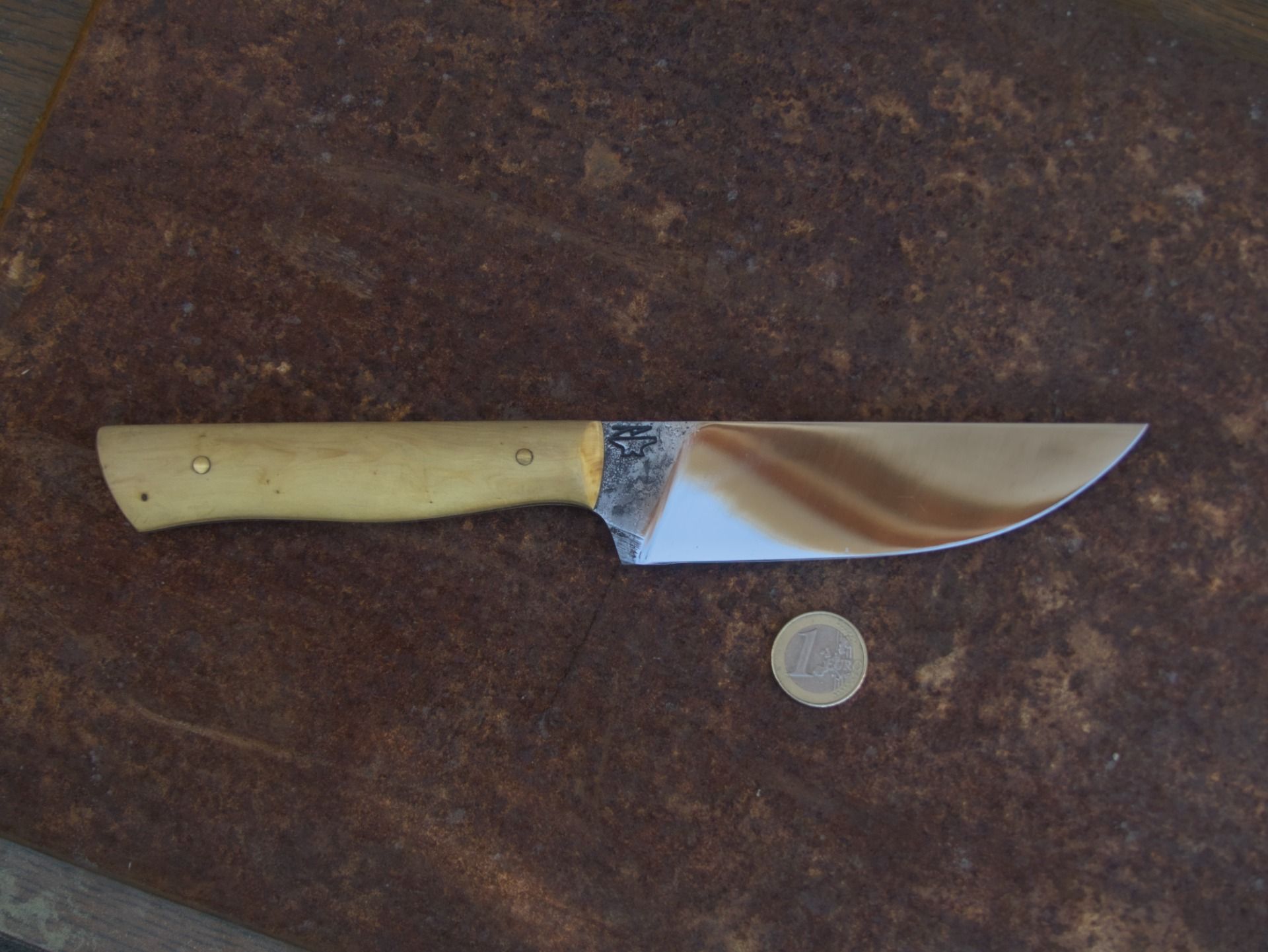 Lame brute de forge, manche en Buis Longueur 25,5 cm, épaisseur 2 mm, hauteur de lame 3,5cm.